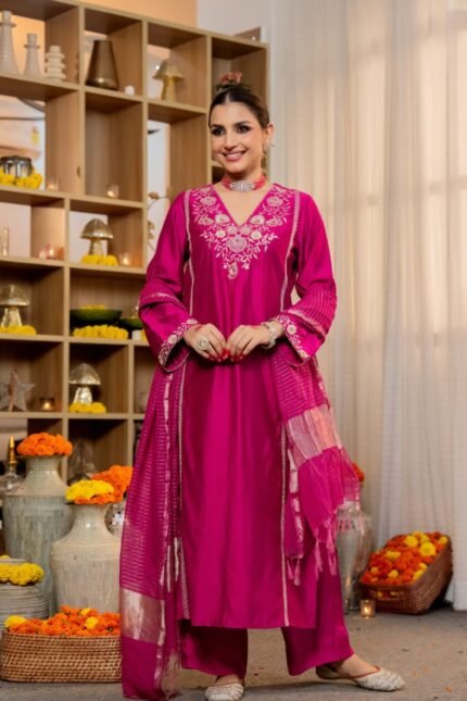 Zinora Chanderi Silk Suit Set for Women – Embroidered Festive Wear with Organza Dupatta