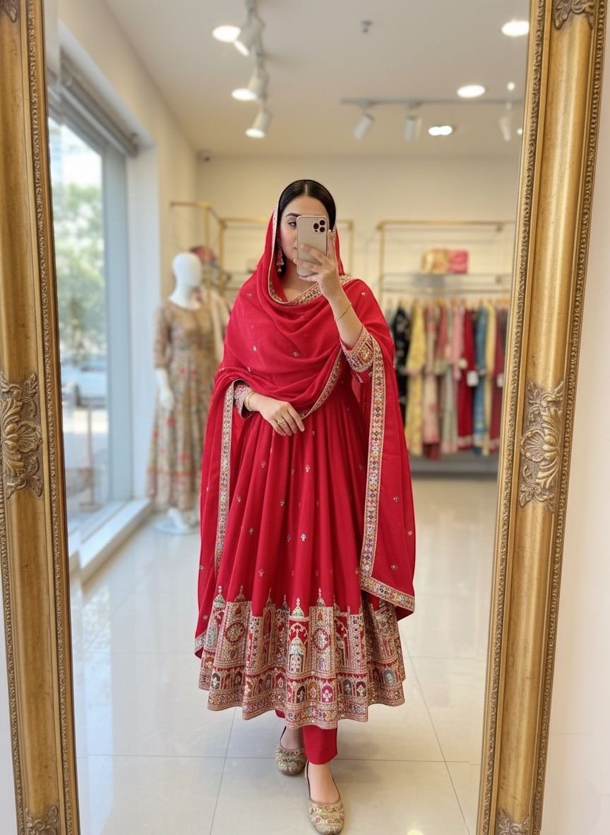 Step into elegance with this stunning Designer Red Gown Set, crafted for women who love timeless ethnic fashion. This fully stitched ready-to-wear outfit includes a beautifully flared gown, matching pant, and a graceful dupatta.