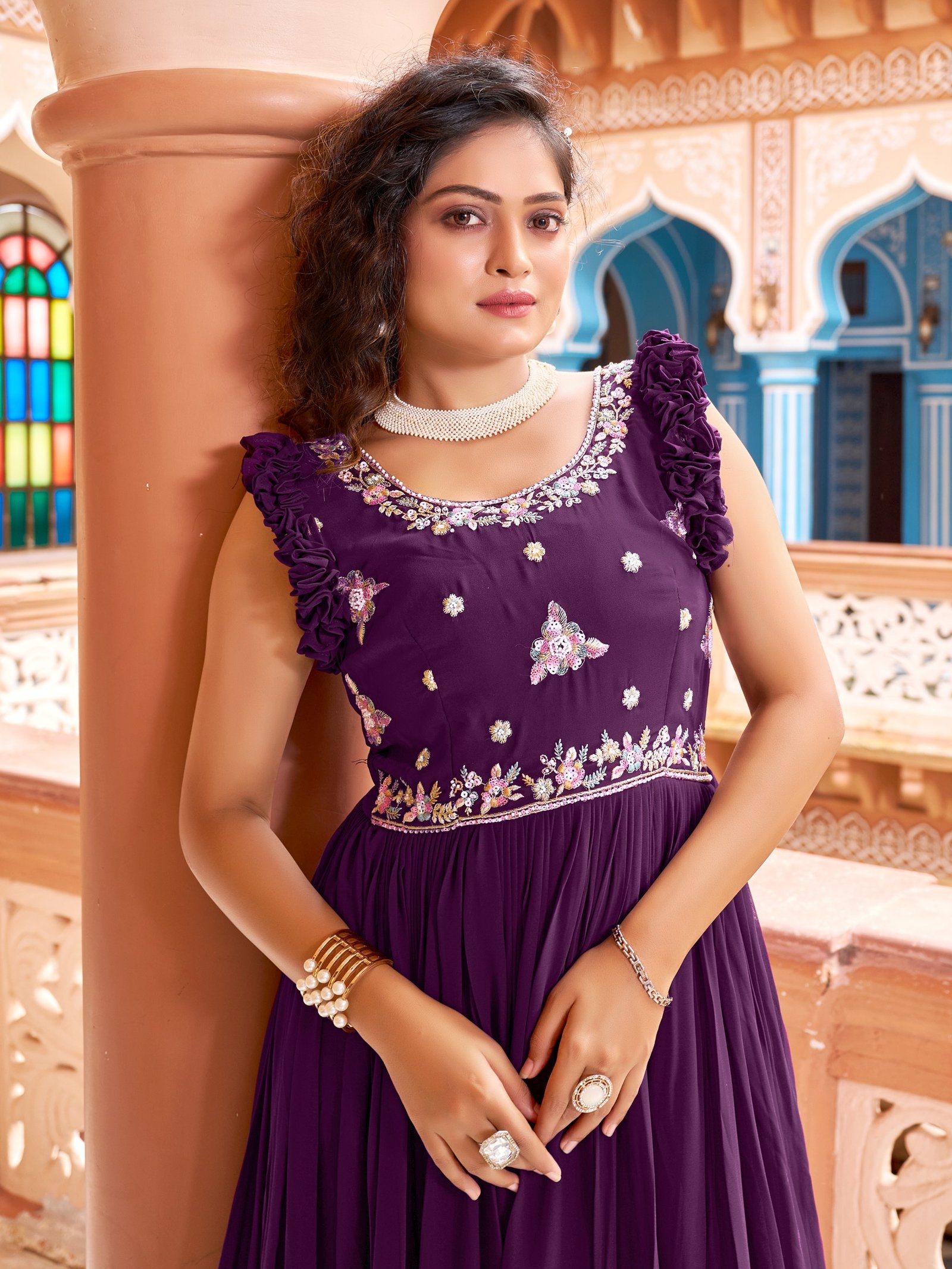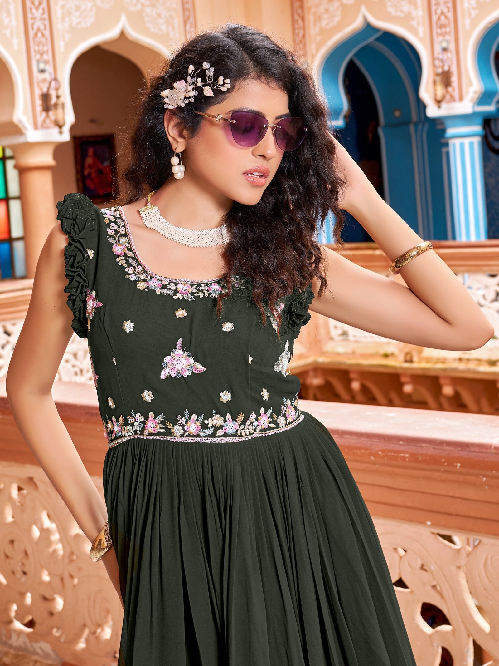Crafted with luxurious faux blooming fabric and detailed zari-sequins embroidery,