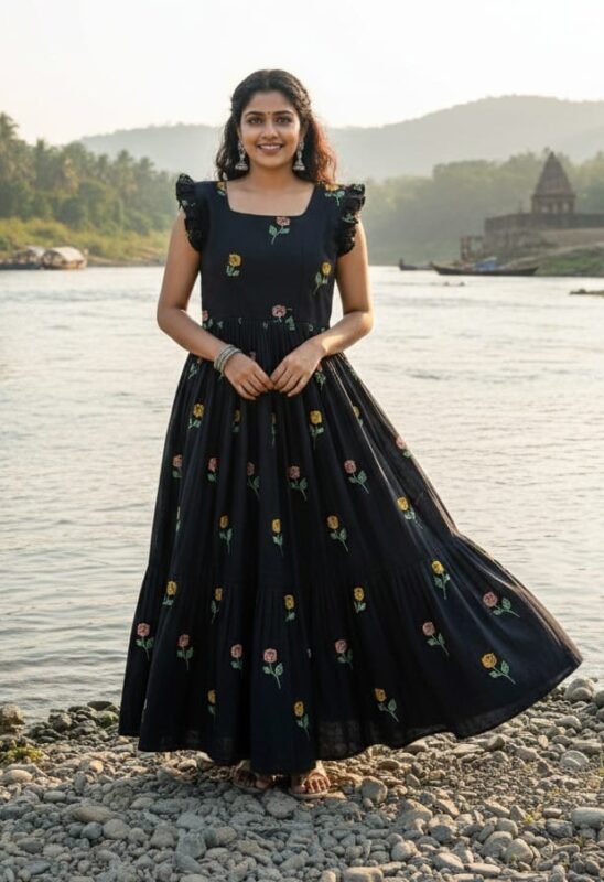 Zinora Black Floral Embroidered Gown for Women – Cotton Fabric | Casual & Festive Wear Long Dress