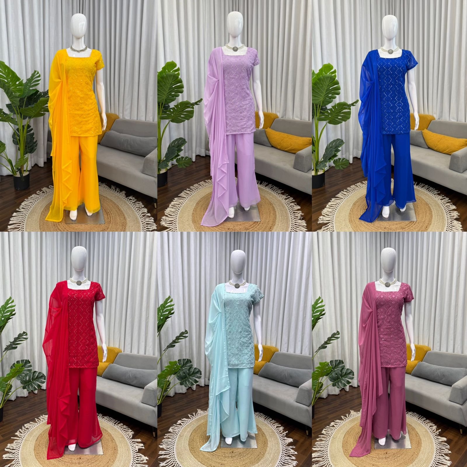 The beautifully embroidered kurti paired with stylish palazzo and flowy dupatta makes it a perfect choice for weddings, festive gatherings, and special occasions