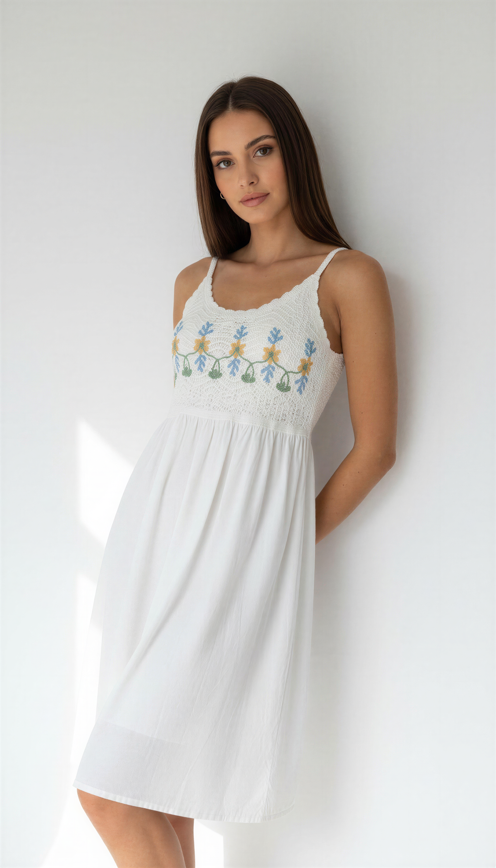 Fresh, light, and effortlessly graceful — this Zinora white summer dress is designed for warm, sun-filled days. Crafted from breathable cotton, the dress features delicate floral embroidery on the bodice, adding a touch of artisanal charm.